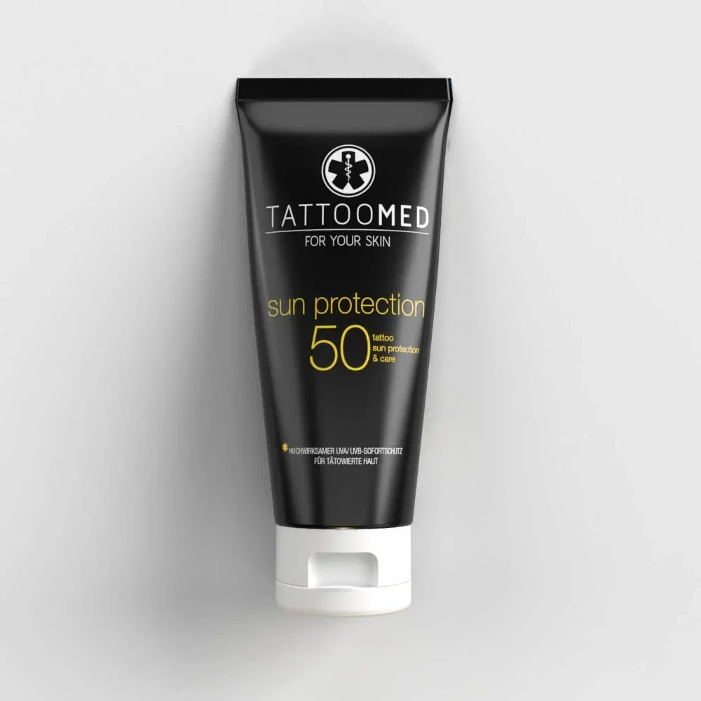 Before sunbathing (whether in the studio or outdoors), your clients should protect the skin with a cream with a suitable sun protection factor. For tattooed skin areas that are not covered by clothing, sun protection is worthwhile even in winter. With the TattooMed Sun Protection 50 cream, your customers can protect and pleasantly care for their tattooed skin when the sun is particularly strong or they are planning a day at the beach or outdoor pool. Thus, no dry veil of skin flakes over the colors and the skin feels caressingly soft and pleasant due to the rapid absorption, not sticky as with many other creams.