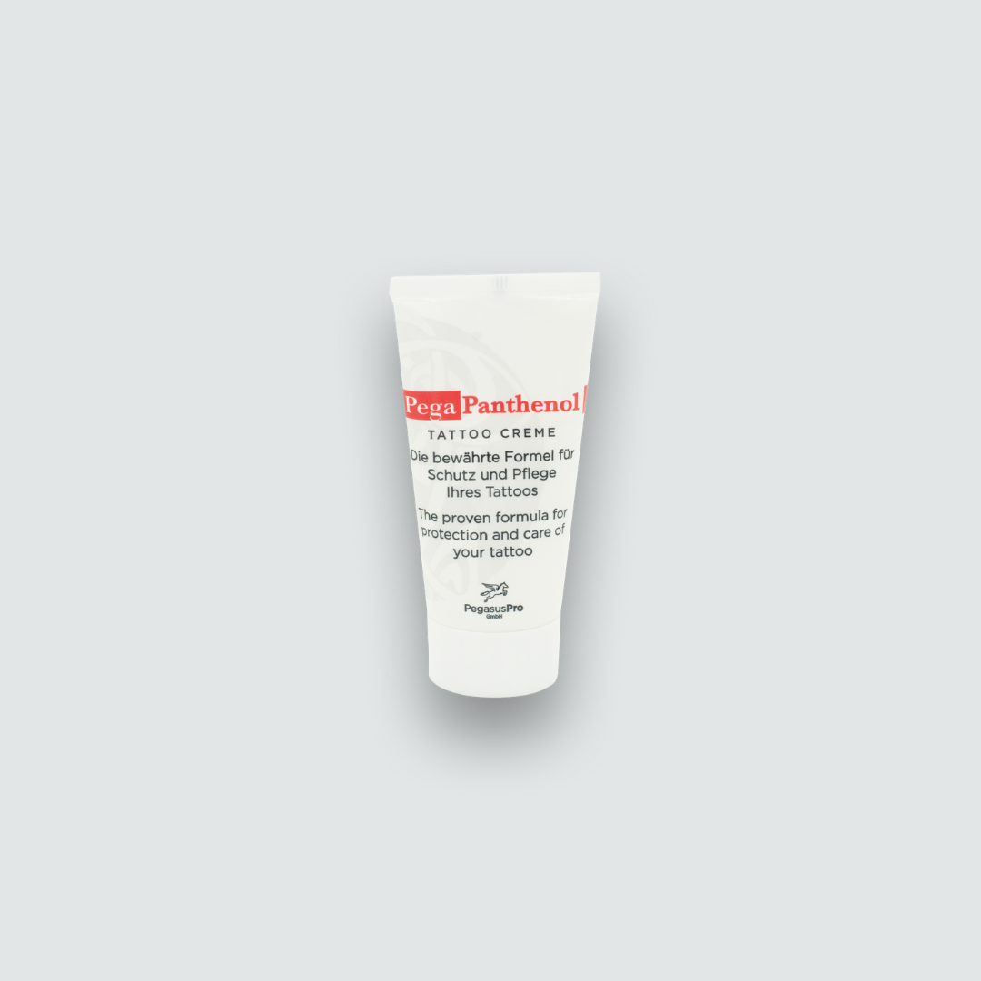 Pegasus PegaPanthenol Cream is produced with a formula that has been tested for decades. The ointment's formula is optimized for the special requirements of tattoo aftercare. The low water content minimizes pigment loss and gently soothes and protects your new tattoo. Pegasus PegaPanthenol Cream can be used to clean broken skin. It has a soft texture and contains moisturizing and soothing qualities. Apply a thin layer of ointment to the skin several times a day for aftercare and protection of tattoos on sensitive skin. A thin application creates an optimal protective film. Perfect for daily use! All Pegasus Pro products are made in Germany, dermatologically tested, and not tested on animals.